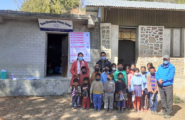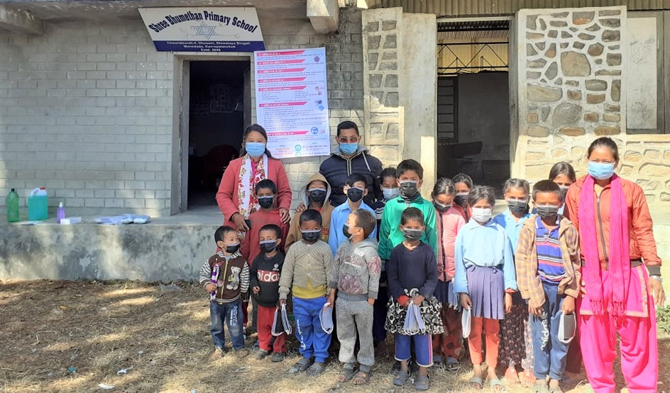 Covid-19 Awareness Plus Covid-19 Preventive Materials distribution Program at Shree Bhumethan Primary School, Chaurideurali-4, Dhuseni Shiwalaya. A thermal gun  and a sanitizer were provided to the school and total 35 students and teachers were given Masks.