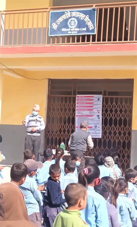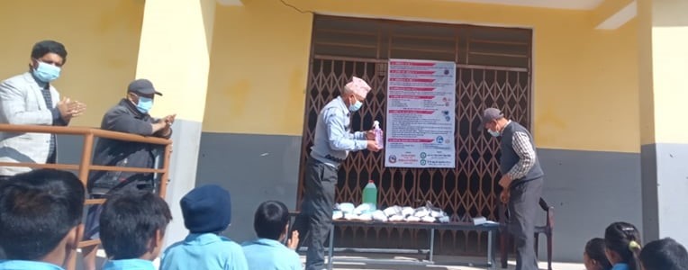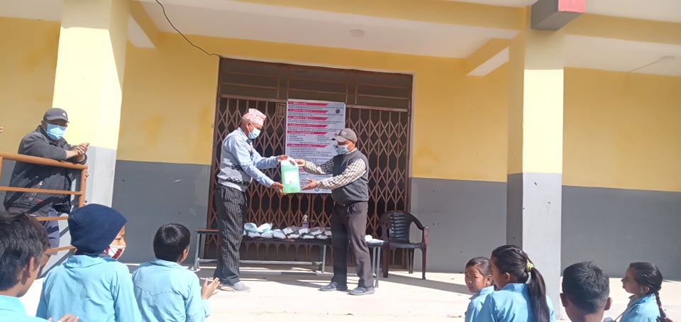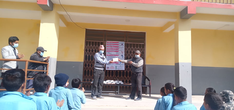Covid-19 Awareness Program plus Covid-19 preventive Materials distribution Program at Jwaladevi Basic School, Chaurideurali 8. A thermal gun and a sanitizer provided to the school and total 81 students 9 teachers got the masks.